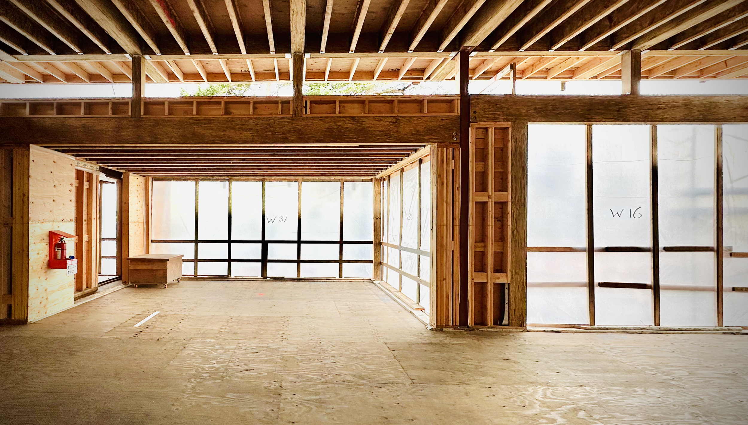 Image of the interior of a building mid construction. Wooden floors and beams are exposed and windows are covered in a protective film. The image is warm with natural light, yet industrial.
